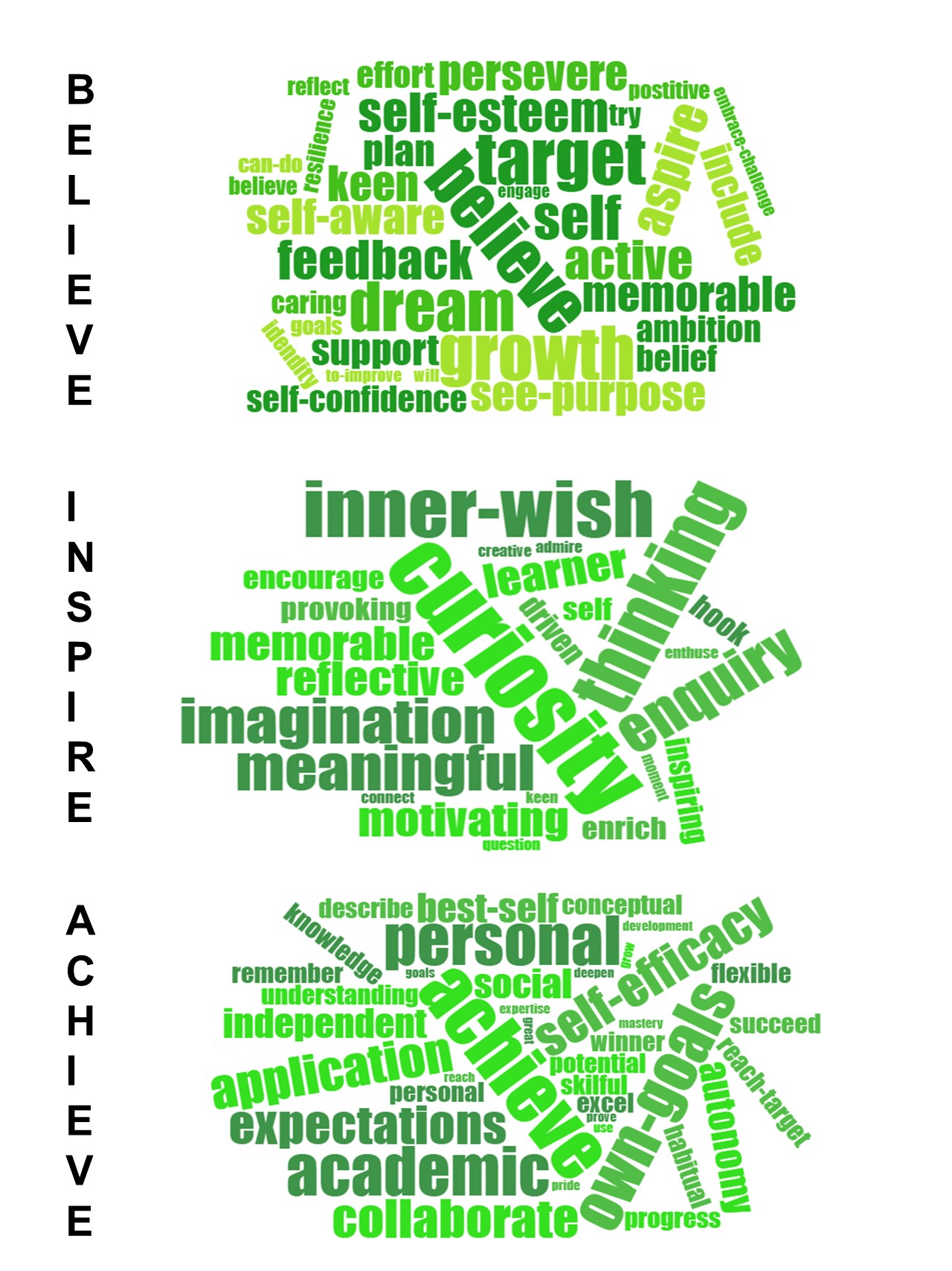 We considered the type of learners we wanted to prepare for life and send on to their next school. If we were to get this approach right we needed to ask pupils, parents, governors and staff the characteristics and values we would like our children to display by the time they leave us. All the words our stakeholders used were then fed into a word cloud creator which made the most frequently chosen words appear bigger. This word cloud describes the type of pupils we wish to develop at Court Lane Academies and is how we arrived at our core values.